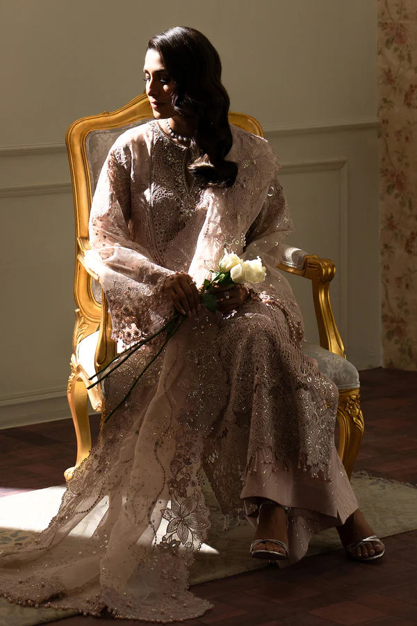 A graceful blend of tradition and elegance, CH13-04 is designed for those who appreciate refined craftsmanship. The richly embroidered organza shirt, featuring sequin detailing on sleeves and borders, offers a luxurious canvas for hand-embellishments like pearls, silver tilla, or Swarovski accents. Paired with a delicate organza dupatta and a smooth dyed silk trouser, this ensemble brings together charm and sophistication for festive occasions or formal wear.