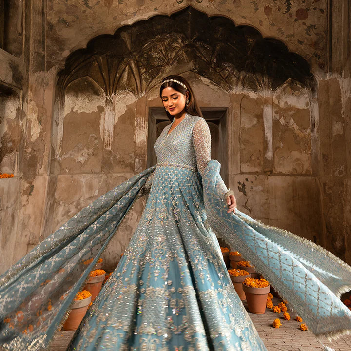 Hana is a spellbinding assemblage of the finest artisanal crafts. Prepared laboriously by exceptionally skilled artisans over several weeks, the mélange of threadwork, sequins, pearls and beads on a sweeping net pishwas is extravagant. Lending an air of regality to the ensemble are the finely ornamented organza dupatta and viscose churidaar in an über-feminine ice blue hue.