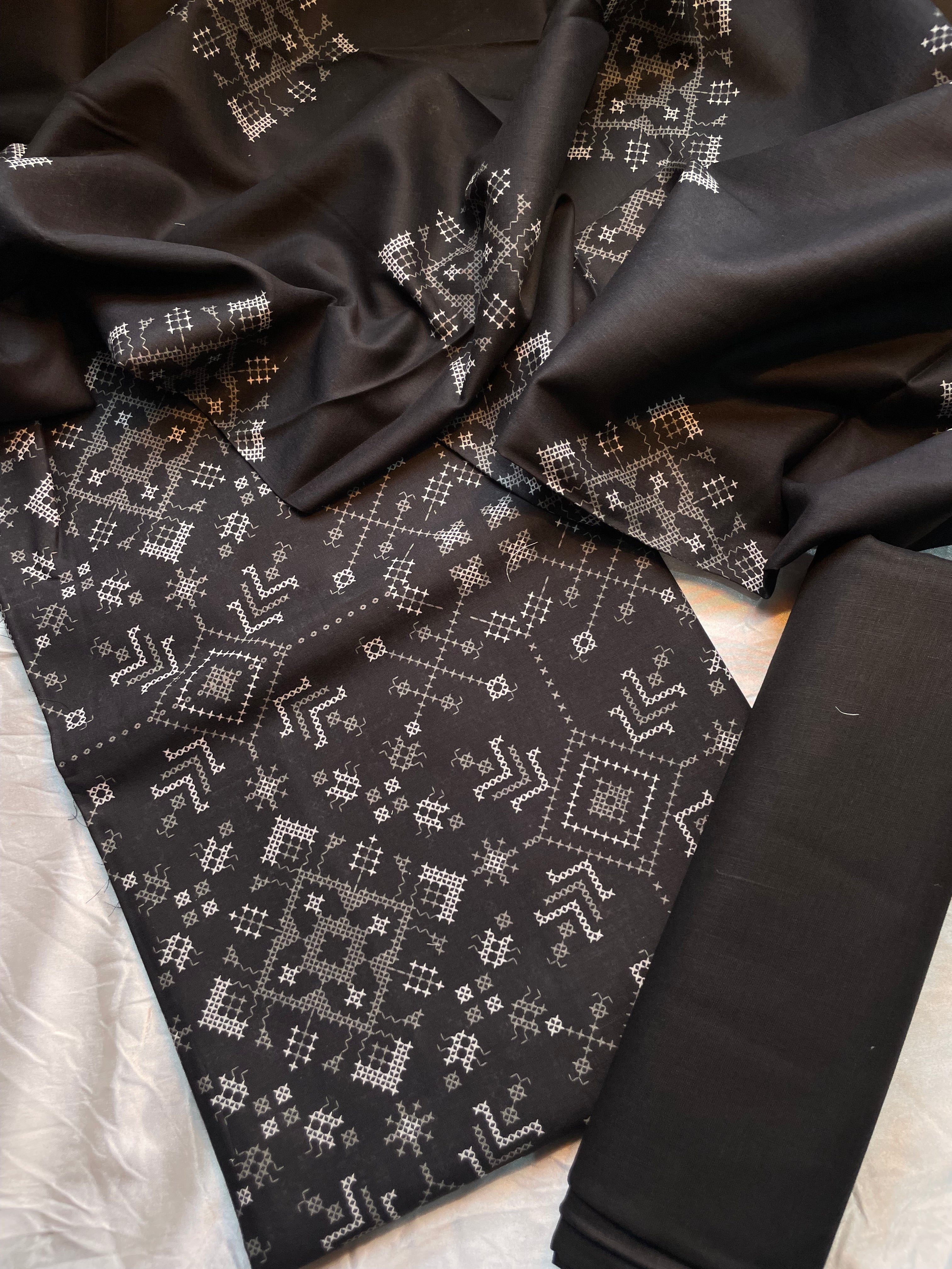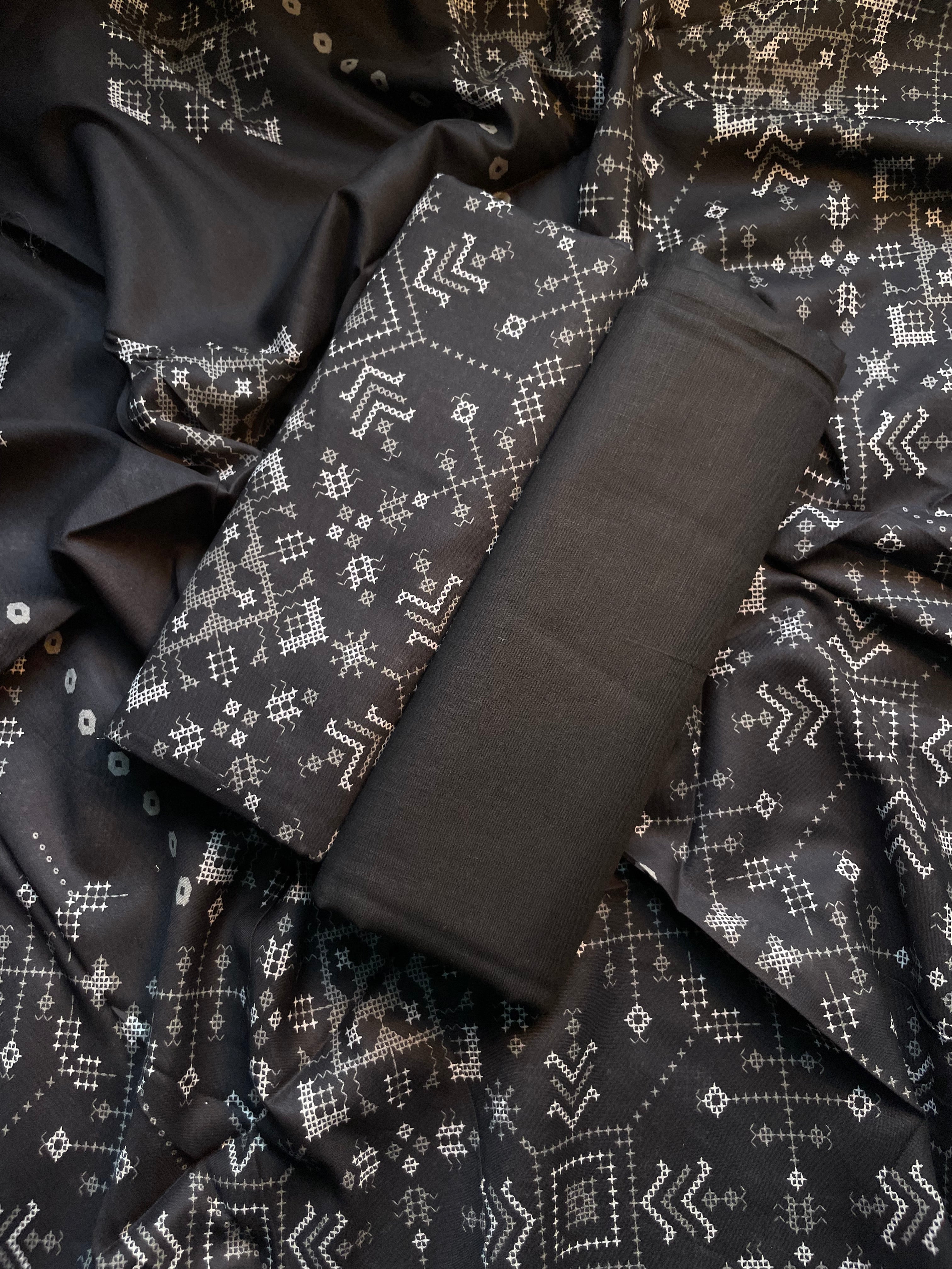 Embrace effortless elegance with this 3-piece printed lawn suit in classic black and white tones. Inspired by ethnic tribal motifs, this suit features a subtle yet striking white geometric print across the shirt and dupatta, beautifully balanced by a solid dyed trouser.